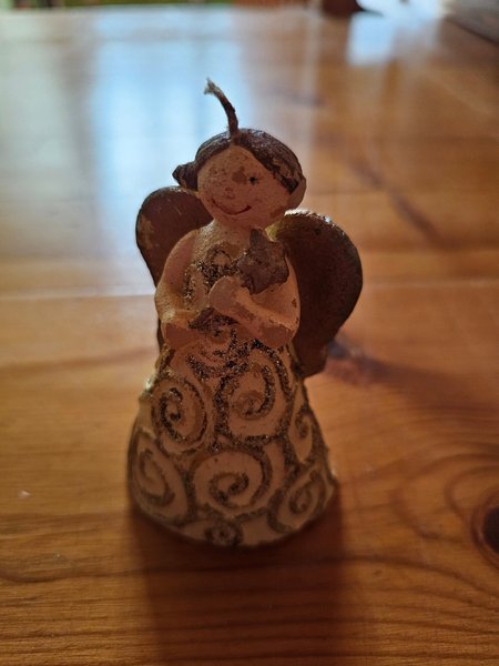 Söt ängel ljusstake med vingar och dekorativ klänning. Håller en stjärna i famnen.