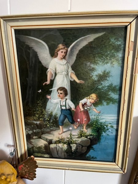 Tavla med ett änglamotiv. Motivet visar en ängel som vakar över två barn vid ett vattendrag. Barnen plockar blommor. Ca A4 storl. Vintage , sliten ram.