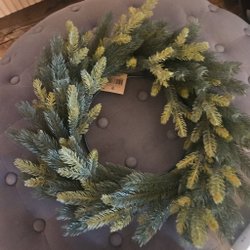 En mindre julkrans med röda och guldfärgade dekorationer. Mått i diameter ca 16 cm.