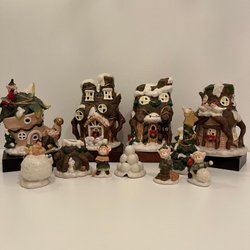 Komplett julby från GULDFYND. Innehåller fem hus, en julgran, en tomte, fyra alfer runt julgröten, tre lekande alfer, två arbetande alfer, en snölykta, två fåglar , två kaniner och ett hus för kaninerna. Alla hus och figurer är i handmålat porslin.