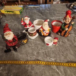 Ett set med tre äldre julgransljusstakar med tomtar. Perfekt för att skapa en stämningsfull juldekoration.