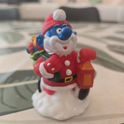 Dekorativ Jultomte som håller i en lykta. Perfekt för Jul , Tomten har en röd luva och ett långt vitt skägg. På ryggen bär han en säck. Keramik, handmålat Höjd 26,5 cm