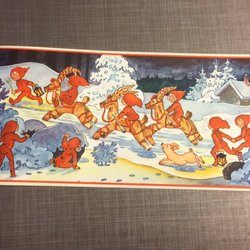 2-pack, gulliga pappersrader med snötyngda granar/julgranar.