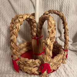 En charmig juldekoration i form av en halmfigur smyckad med en söt tomte, röda band, kottar och torkade växter. Perfekt för att sprida julstämning i hemmet! Upphängning på baksidan för att hänga upp den på ytterdörren eller annan plats.