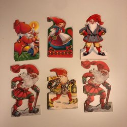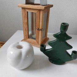 Diverse juldekorationer. Inkluderar en älg, en snöglob, en stor tomte, en tärnljus från Konstsmide och en lite mindre tomte.
