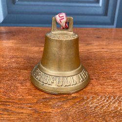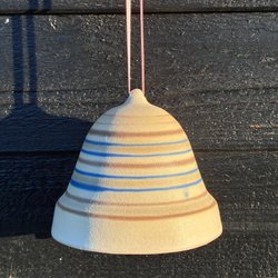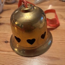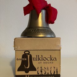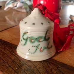 Antik julklocka i keramik med God Jul text i glasyren
