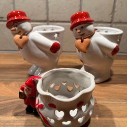 Dessa keramiska miniatyrhus är dekorativa föremål som representerar en julby eller vinterby, typiska för juldekorationer som blev populära under sent 1900-tal. Husen är utformade med snötäckta tak och detaljer som ger dem ett vinterlandskapsutseende.