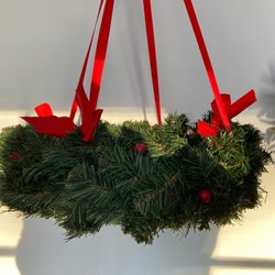 En mindre julkrans med röda och guldfärgade dekorationer. Mått i diameter ca 16 cm.