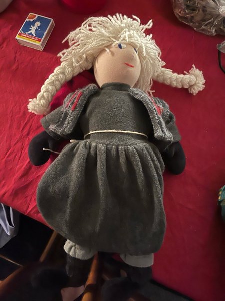 Mjuk docka i tyg med grå klänning och vitt hår. Dockan är ca 40 cm lång. Mjuk stoppning, köpt på hantverksmarknad. Bara använd som prydnad.