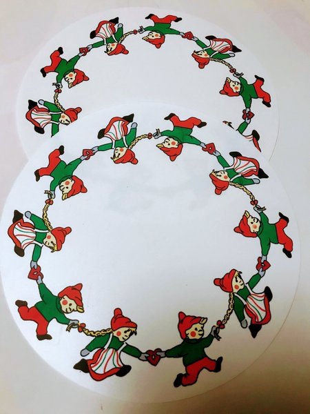 12 stycken runda bordstabletter i plastmaterial till jul. Tabletterna är cirka 25 cm i diameter.