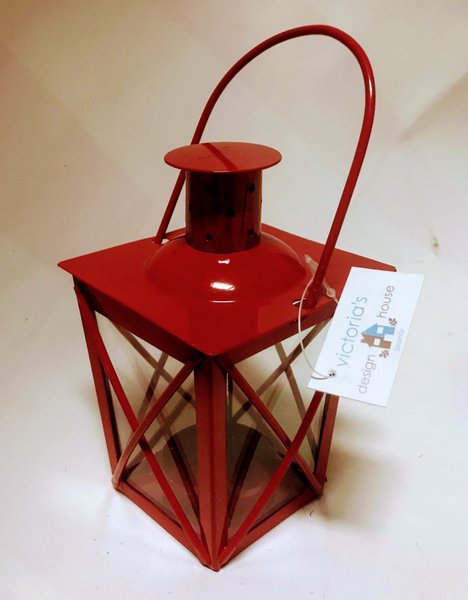 4 röda smideslyktor med glas för värmeljus. Lyktorna är cirka 15 cm höga (glasrutorna är cirka 9 cm höga) och passar fint att hänga upp. Vi har fler lyktor i lager och lägger upp nya annonser löpande.
