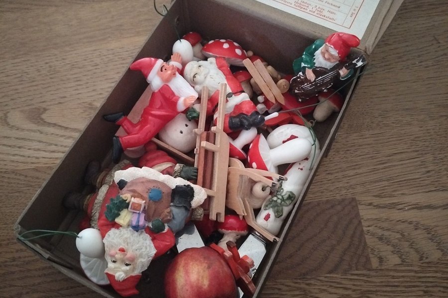 Julprydnader i en låda. Innehåller tomtar, svampar och andra juldekorationer,mm