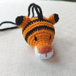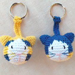 5 virkade katter i gult och lila bomullsgarn.