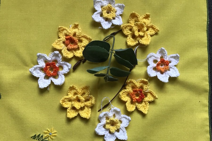 Ny virkade påskliljor 8 st i bomullsgarn.