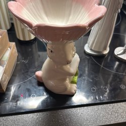 Två påskharar i svart och silver. Den ena haren bär en korg med ägg, och den andra haren bär en väska. Båda hararna står på en rund bas.