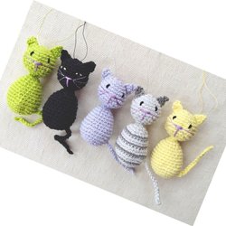 5 virkade katter i mintgrönt, vitt och rosa bomullsgarn.