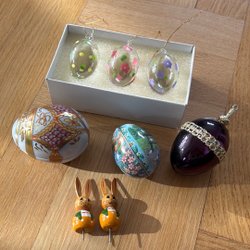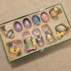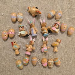 Detta set innehåller påskpynt i trä. Pyntet består av figurer som harar, kycklingar,gubbar samt målade ägg. Alla delar har en ögla för upphängning.