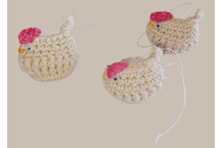 3 virkade hönor. Hönorna är i beige med rosa kam och orange näbb. De har en tråd för upphängning.