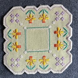 En broderad påskduk av grovt grå aidaväv med påskägg och blommor. Broderad i korsstygn av bomullsgarn