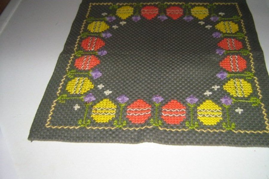 En broderad påskduk av grovt grå aidaväv med påskägg och blommor. Broderad i korsstygn av bomullsgarn