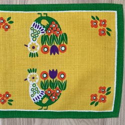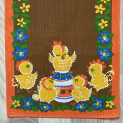 Bordslöpare i gult tyg med broderade påskmotiv av blommor och kycklingar. Bra skick men behöver strykas