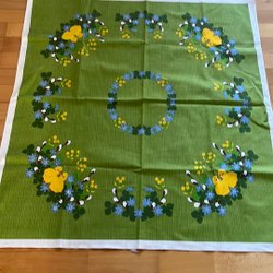 Retro Rektangulär påskduk i grönt med motiv av kycklingar och blommor. Storlek 90x80 cm. Duk i gott skick med tanke på ålder o användning. Någon liten fläck, se bild