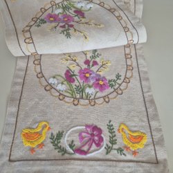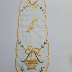 En oval påskduk, handbroderad på tunn väv, tuppar, vide kvistar påskliljor och kycklingar pryder den välgjorda skira duken, även texten "Glad påsk" ses i båda ändarna.En gul frans kant ramar in duken. Dukens mått är 62x30 cm.