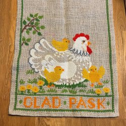 Påskduk med sandfärgad botten och maskinbroderat påskdetaljer i rosa och brunt. Mått 30x70 cm.