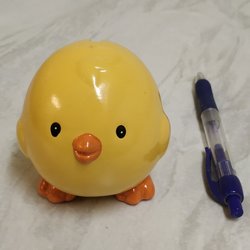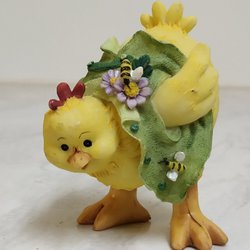 Påskdekoration, gul kyckling med haklapp, omgiven av blommor och gräs. Av keramik/porslin. Retro påskkyckling. Okänd design. Diameter vid vingarna: 13 cm, höjd ca 16 cm vid huvudet. Bra skick. Fler påsksaker i mina andra annonser.