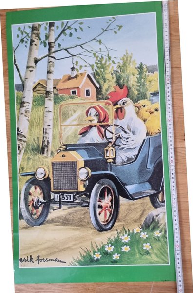 Affisch med motiv av en tupp som kör bil, med kycklingar i baksätet. Konstnären Erik Forsman har signerat affischen. Mått: 75 x 50 cm.