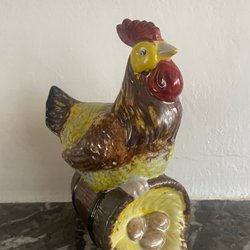 Påskhöna för att förvara ägg eller godis. Den består av två delar: en överdel formad som en höna och en underdel formad som en korg. Tillverkad i Kina.