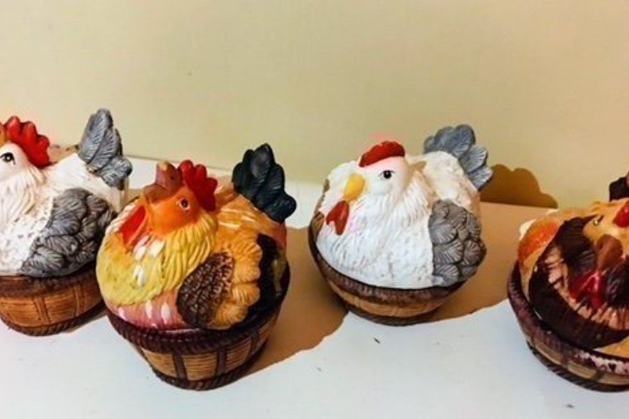 2 vita och 2 mörka keramikhönor. Hönorna är i två delar och mindre föremål som pärlor eller pynt kan förvaras i hönan. Hönorna är ca 10 cm höga. Vi har fler hönor i lager och lägger upp nya annonser löpande.