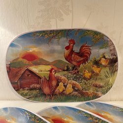 Sex äggkoppar i metall med dekorativ höna. Aldrig använda, plastförpackning kvar. Mått 8 cm hög. Fint skick.