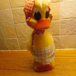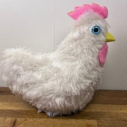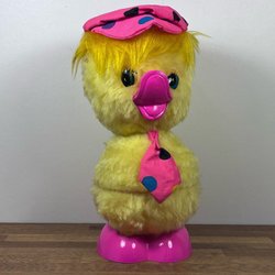 Påskkyckling i plast och fuskpäls. Kycklingen kan öppnas för att gömma godis eller små presenter. En tändsticksask är med på bilden för storleksjämförelse.
