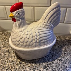 Dekorativ keramikhöna i vitt med svarta detaljer. Hönan har en röd kam och näbb.