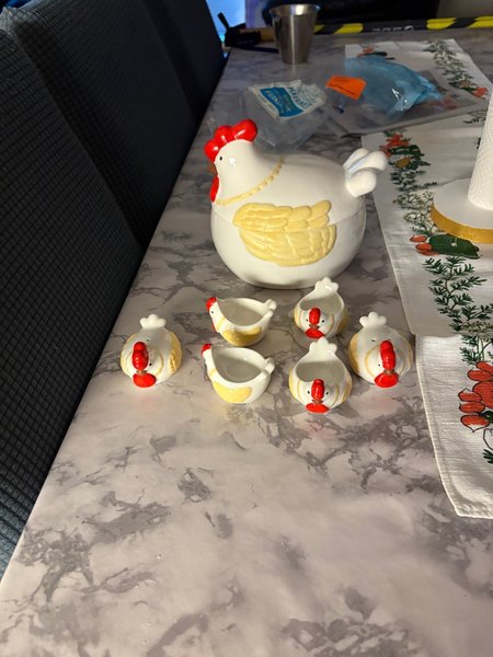 En uppsättning med en stor keramikhöna och matchande äggkoppar samt salt/peppar kar.