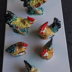 Parti med påskpynt i form av hönor och tuppar. En stor gul höna (ljus) , två svarta tuppar med färgglada detaljer och fyra mindre hönor/tuppar i varierande färger.