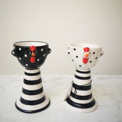Ett charmigt set med tre dekorativa påskfigurer i olika höjder. Figurerna är av vitmålat trä med svartrandigt mönster och detaljer i rött, fötterna av metall (stål), alla figurer står stadigt utan stöd. Perfekt inredningsdetalj i grupp eller som solo.