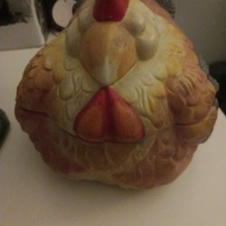 En keramikhöna i gult, grönt och orange. Höna sitter i en korg.