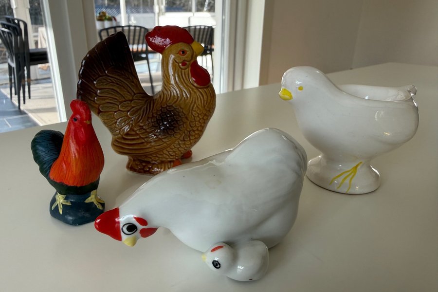 Fyra keramiska figurer föreställande hönor och tuppar. En stor tupp i bruna nyanser, en mindre tupp i rött och blått, en vit höna med en kyckling och en vit höna som kan användas som äggkopp.