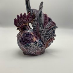 En färgglad tuppfigur. Figuren har detaljer i rött, gult, brunt, svart och turkos.
