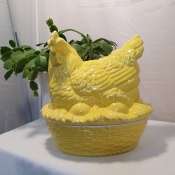 En dekorativ ägghöna med lock i målad keramik, perfekt för förvaring eller som prydnad.