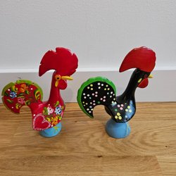 Den ena Figuren är gul med röda detaljer på kammen och stjärten. Den har en texturerad yta på kroppen.