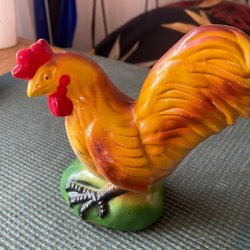 Figurin med hönsmotiv. Föreställer en tupp, en höna och två kycklingar vid en foderho. Detaljerade färger och texturer. Basen är klädd med röd filt.