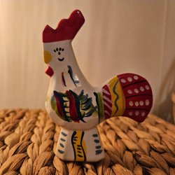 Denna tuppfigur är tillverkad av keramik och har en glansig yta. Figuren är målad i vitt, gult, rött, grönt och svart. Den föreställer en tupp med en röd kam och stjärtfjädrar i grönt och svart. Tuppen står på en liten bas.
