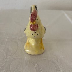En liten tuppfigur i keramik. Figuren har en röd kam och stjärtfjädrar i grönt och svart. Kroppen är vit och gul. Denna tuppfigur kan användas som dekoration i hemmet.