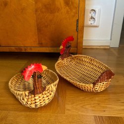 Påskpynt i form av två hönor, en tupp och fyra kycklingar. Färgerna är bruna, gula, röda och gröna. Funnits med länge. Är hela.