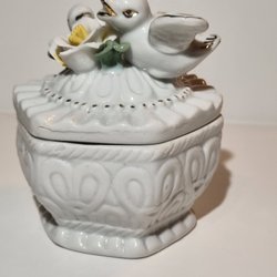 Denna charmiga kycklingformade kruka är tillverkad av keramik och har en gul färg med bruna detaljer. Den kan användas som en dekorativ prydnad eller för att plantera små växter.
