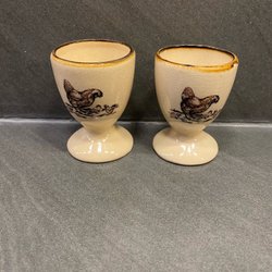 Två ägghållare, en i metall och en i svart.