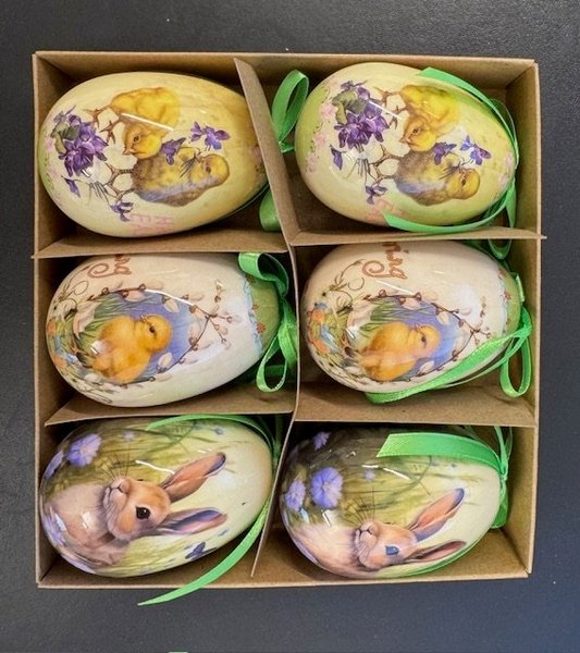 Underbara påskägg att hänga i påskriset. Kommer i en 6-pack och varje ägg är 6 cm.